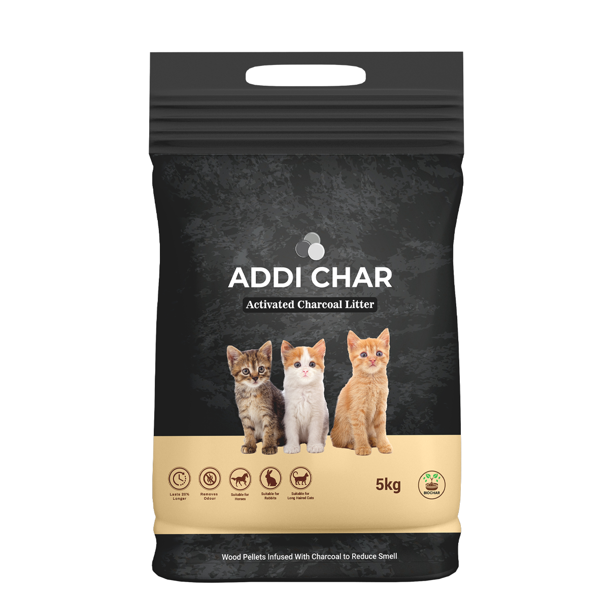 ADDI CHAR Premium Litter is a highly absorbent, odour removing, compost friendly, charcoal infused wooden litter. Addi Char is a minimal tracking litter that can be used in both single layer and double layer litter trays. A Charcoal infused wooden pellet, it is the most comprehensive wooden litter pellet on the market.